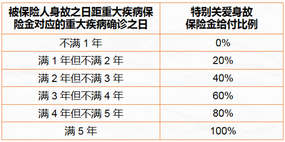 如果附加特别关爱身故保险金,确诊重疾后身故,保险公司会按基本保额的一定比例给付特别关爱身故保险金。
