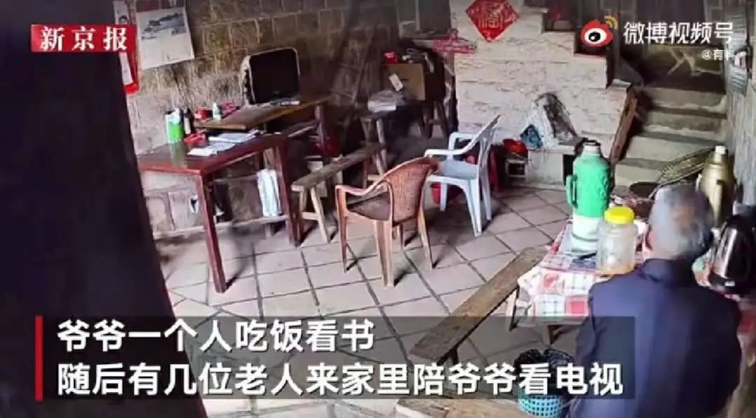 视频中的老人居住环境简单,从早晨起床洗漱开始,做什么都是独自一人:一个人吃饭,一个人看书,一个人在这不大的房子中走动……