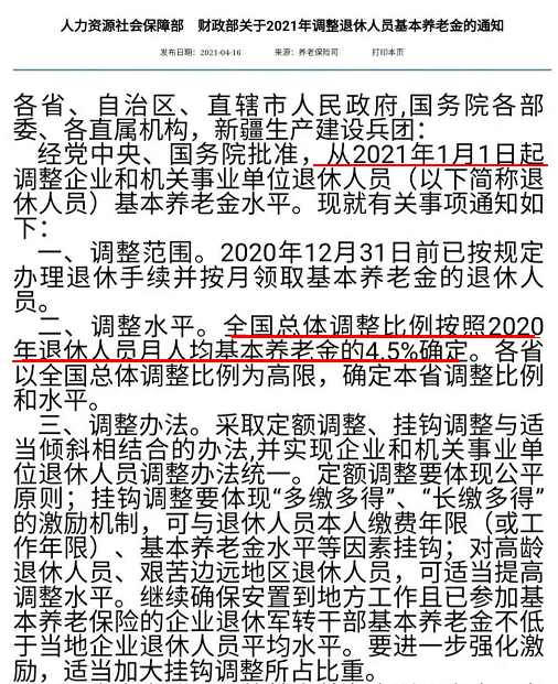 近日,人社部、财政部印发通知,明确从2021年1月1日起,基本养老金上涨4.5%。