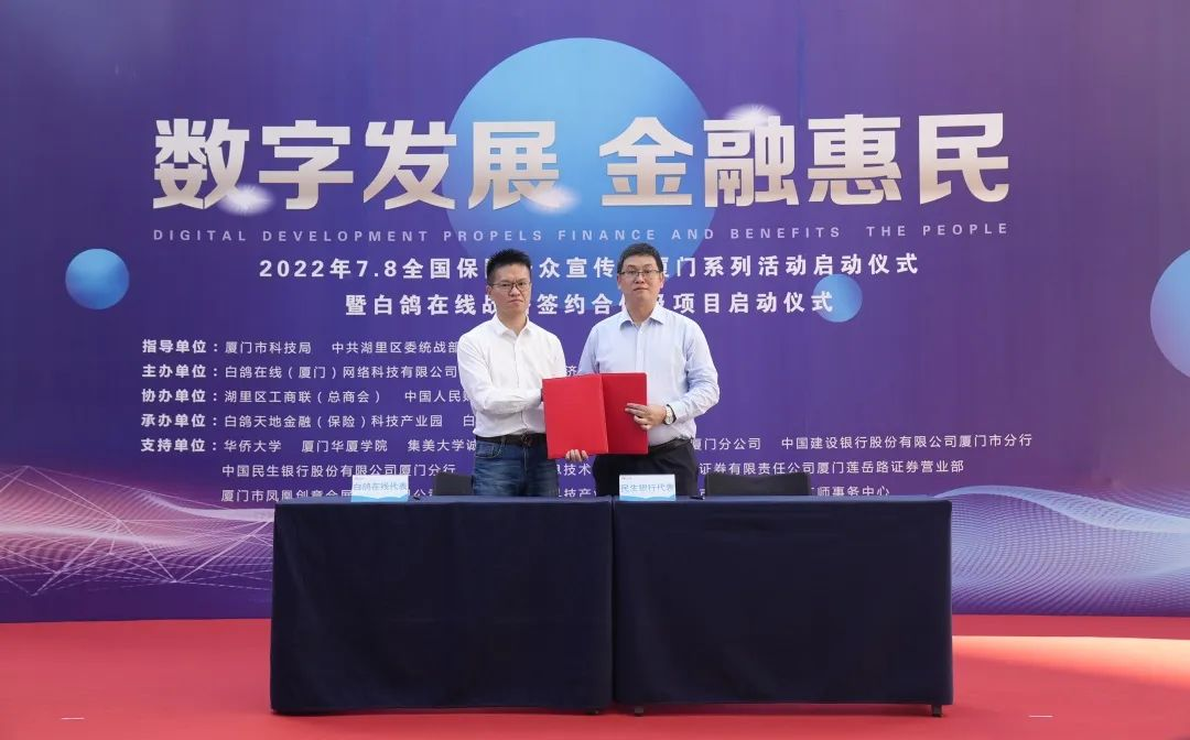 2022年7月8日上午,“7.8全国保险公众宣传日”厦门系列活动启动仪式暨白鸽在线战略签约合作及项目启动仪式在厦门市湖里区白鸽天地金融(保险)科技产业园圆满落幕。