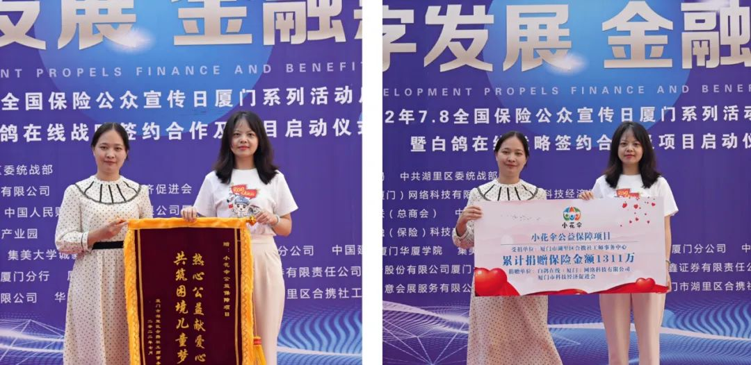 小花伞公益保障项目是通过互联网技术将保险保障机制融入社会公益,以此来帮扶社会保险需求困难户。作为厦门系列活动之一,小花伞公益保障项目捐赠仪式在现场举行,白鸽在线及厦门市科技经济促进会向厦门市湖里区合携社工师事务中心进行了1311万的保险金额捐赠。厦门市湖里区合携社工师事务中心为感谢小花伞公益保障项目在帮扶困境儿童上做出的突出贡献,向小花伞公益保障项目授予了爱心锦旗。