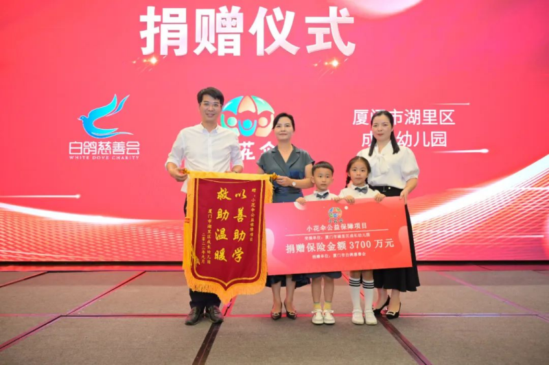 为推动公益慈善事业发展,小花伞公益保障项目负责人陈平凤向与会嘉宾介绍了小花伞项目的创办初衷、宗旨、规模及未来发展规划等。作为厦门市白鸽慈善会的公益项目之一,小花伞公益保障项目捐赠仪式在晚宴现场举行,厦门市白鸽慈善会向厦门市湖里区成长幼儿园捐赠了白鸽公益学平险,保险金额3700万元。厦门市湖里区成长幼儿园为感谢白鸽慈善会在助力儿童平安成长上做出的突出贡献,向其授予了爱心锦旗。