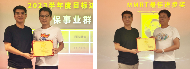 2023年初,配合战略推进需要,公司发布了营销竞赛激励政策,持续完善团队和营销体系的搭建,挖掘业务增长潜力。在上半年的竞赛中,e保事业群以目标达成率119.74%,同比增长77.48%,环比增长48.22%的优秀指标荣获“2023半年度目标达成奖”,同时MMRT营销管理干部郭庆忠在公司人才培育计划中脱颖而出,获“MMRT最佳进步奖”,本次会议上进行了两个奖项的表彰仪式。现场还发布了新的营销竞赛激励政策,进一步发挥指标“风向标”、考核“指挥棒”作用,同时放大奖励“乘数效应”。