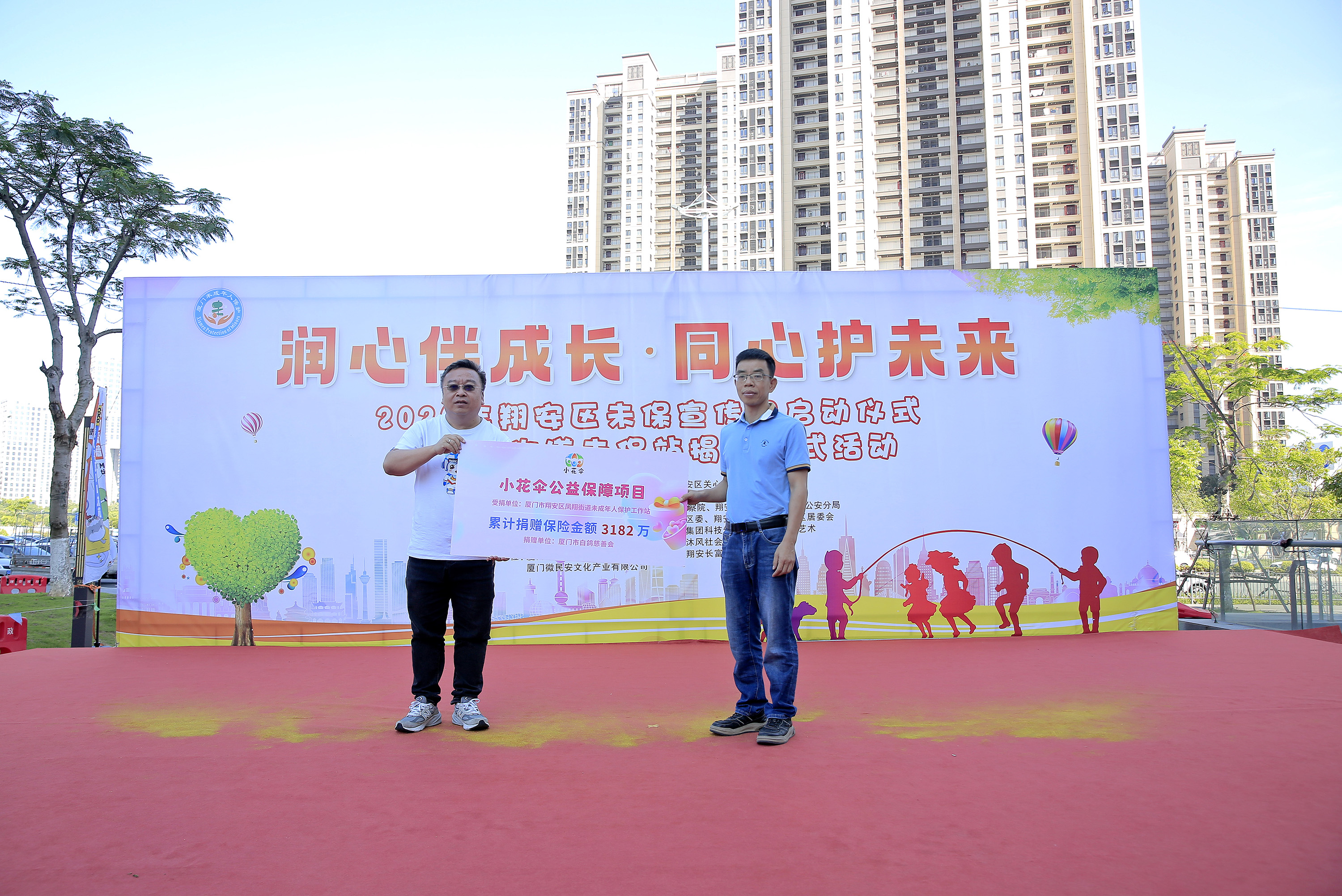 在此次活动中,市白鸽慈善会小花伞公益保障项目为凤翔街道172名在校困境儿童捐赠学平险,保额价值达3182万元。活动现场举行了捐赠仪式以及共建授牌仪式。厦门市沐风社会服务中心负责人马力与执行理事陈智勇为市白鸽慈善会颁发了共建单位牌匾。
