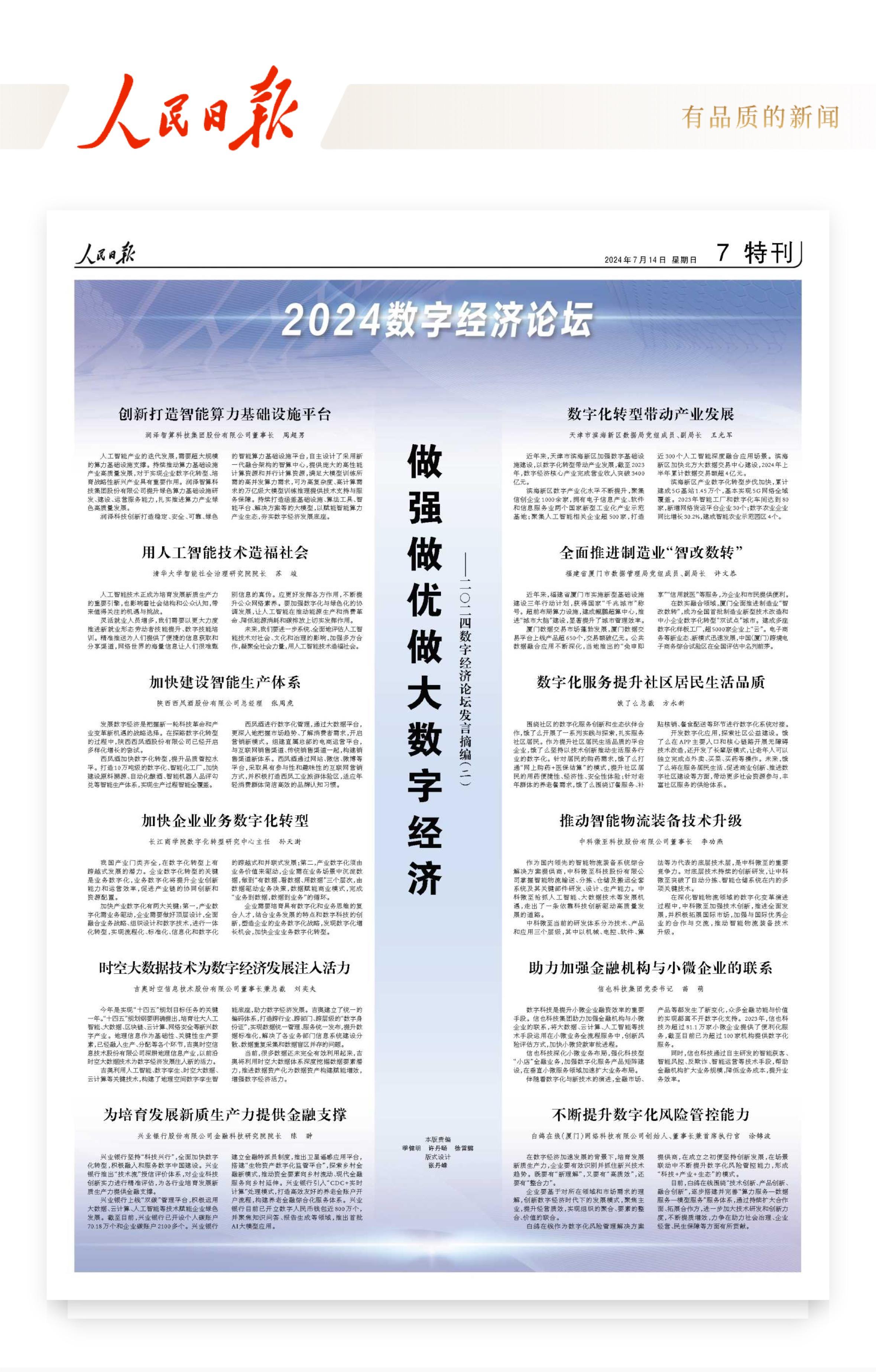 7月14日,人民日报以《不断提升数字化风险管控能力》为题,刊发涂锦波在2024数字经济论坛中的署名发言摘编