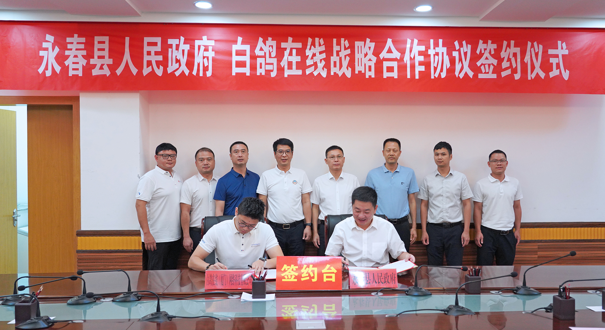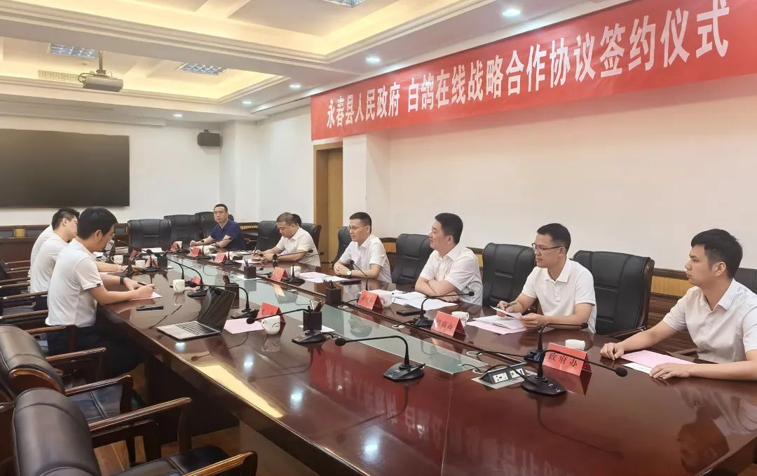8月9日,白鸽在线与泉州市永春县签订战略合作协议。永春县县长张照绿、白鸽在线创始人兼CEO涂锦波及县政府办、教育局、交通运输局、招商办主要负责人出席见证,永春县副县长王卫阳与白鸽在线副总经理柯葳彬代表签署协议。仪式前,双方就进一步深化战略合作进行座谈交流。