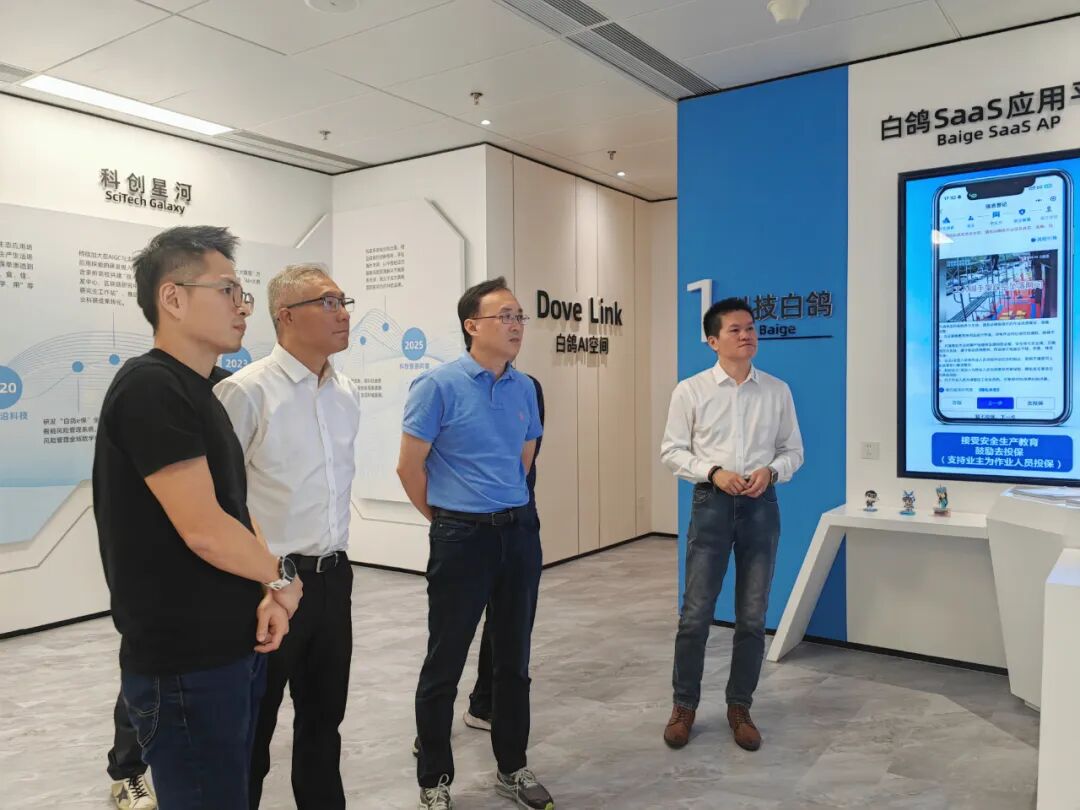 库立军一行先后参观了企业总部及Dove Link白鸽AI展厅,系统了解白鸽在线的核心产品与技术研发能力。施文铮详细介绍了白鸽在线如何以“科技+金融+场景”为核心,通过整合人工智能、大数据分析与云计算技术与自研MaaS模型,为企业提供风险保障、评估与预防三位一体的数字化风险管理解决方案。